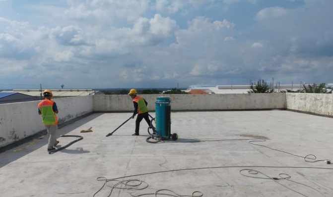 - Trường hợp không rửa được bằng nước thì dùng máy hút bụi công nghiệp và hút sạch đảm bảo bề mặt sạch hết bụi bẩn rồi mới thi công bước tiếp theo.