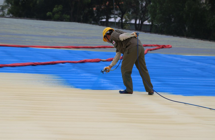 - Dùng máy phun hoặc lu lăn một lớp lên trên lớp foam chống nóng.